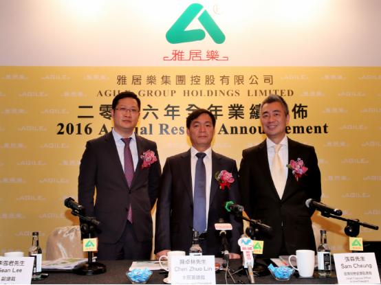 雅居樂集團(tuán)主席兼總裁陳卓林(中)及管理層出席2016年業(yè)績(jī)發(fā)布會(huì)